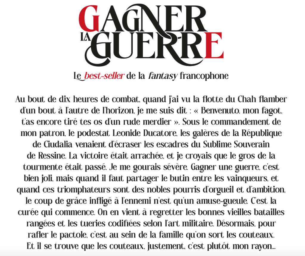 Gagner la Guerre est un grand roman d’aventures raconté à la première personne, qui nous plonge dans les aventures de Don Benvenuto, assassin sans morale travaillant pour le compte du podestat Leonide Ducatore, le plus haut dirigeant de la République de Ciudalia, rappelant bien évidemment les Républiques de Florence et Venise pendant la Renaissance italienne. Avec parmi ses principales sources d’inspiration Le Prince de Machiavel, Gagner la Guerre nous invite à voir, à travers les yeux d’un truand, une République déliquescente et corrompue. C’est aussi un grand roman d’aventures au langage fleuri, que l’on a du mal à quitter une fois refermé.