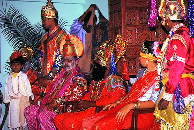 [2] Il s’agit d’une forme de spectacle héritée du théâtre populaire et rural du Pays tamoul, mettant en scène des épisodes de la grande épopée du Mahâbhârata (« Barldon » en créole réunionnais). Cette pratique s’inscrit notamment dans la période des dix-huit jours de préparation à la marche sur le feu, qui elle-même trouve ses racines dans le Mahâbhârata.
