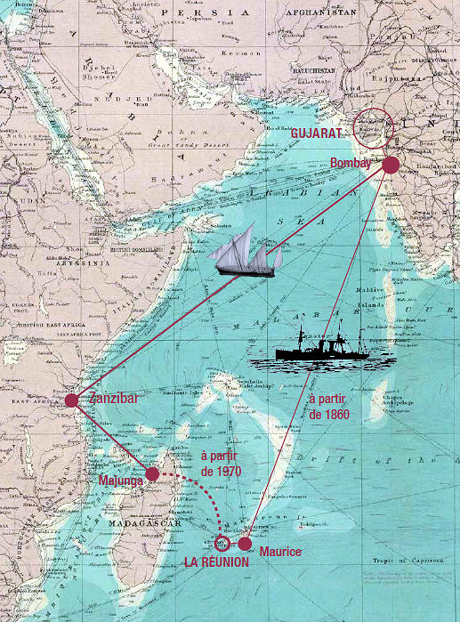 SAHARA CASSIM : Ces termes désignent les Réunionnais d’origine gujaratie dont les parcours migratoires diffèrent dans le temps et l’espace. Au milieu du XIXe siècle, des raisons socio-économiques poussent de nombreux Gujaratis, originaires du nord-ouest de l’Inde, à l’exil. Ils sont, au moment de leur départ, sujets britanniques. D’une part, le Gujarat est confronté à des périodes de sécheresses provoquant de graves famines. D’autre part, au cours de la même période, un nouveau marché s’ouvre dans les colonies de plantation des territoires méridionaux de l’océan Indien. L’introduction de travailleurs engagés, suite à l’abolition de l’esclavage, inaugure une nouvelle phase. Leur contrat d’engagement impose à l’employeur une quantité réglementaire de nourriture et de textile créant une nouvelle demande. Ce sont précisément ces deux facteurs qui sont à l’origine de l’exil des populations originaires du Gujarat, facilité par la longue tradition commerciale de la région.