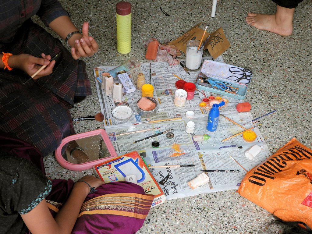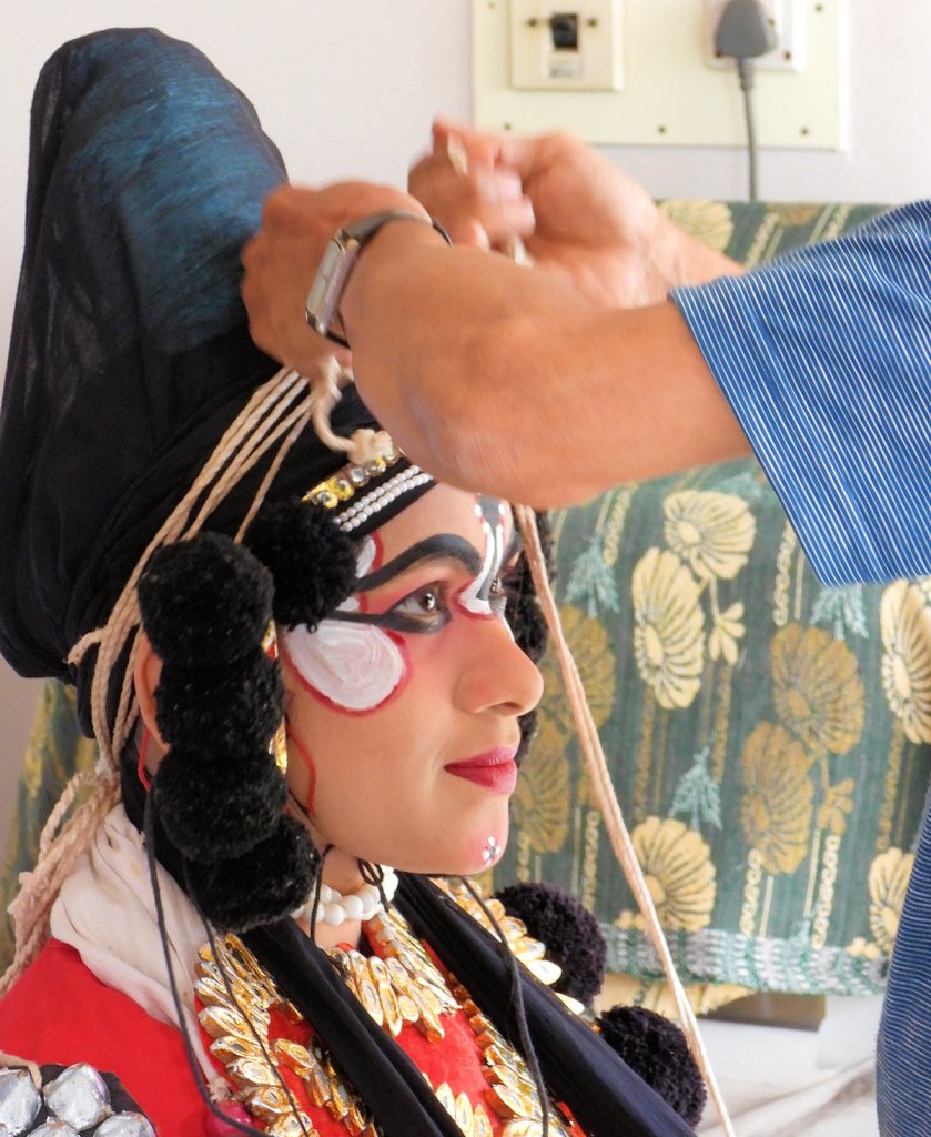 La représentation de Yakshagana est précédée d’une longue session de préparation : le maquillage et l’habillage font progressivement entrer l’artiste dans son rôle.