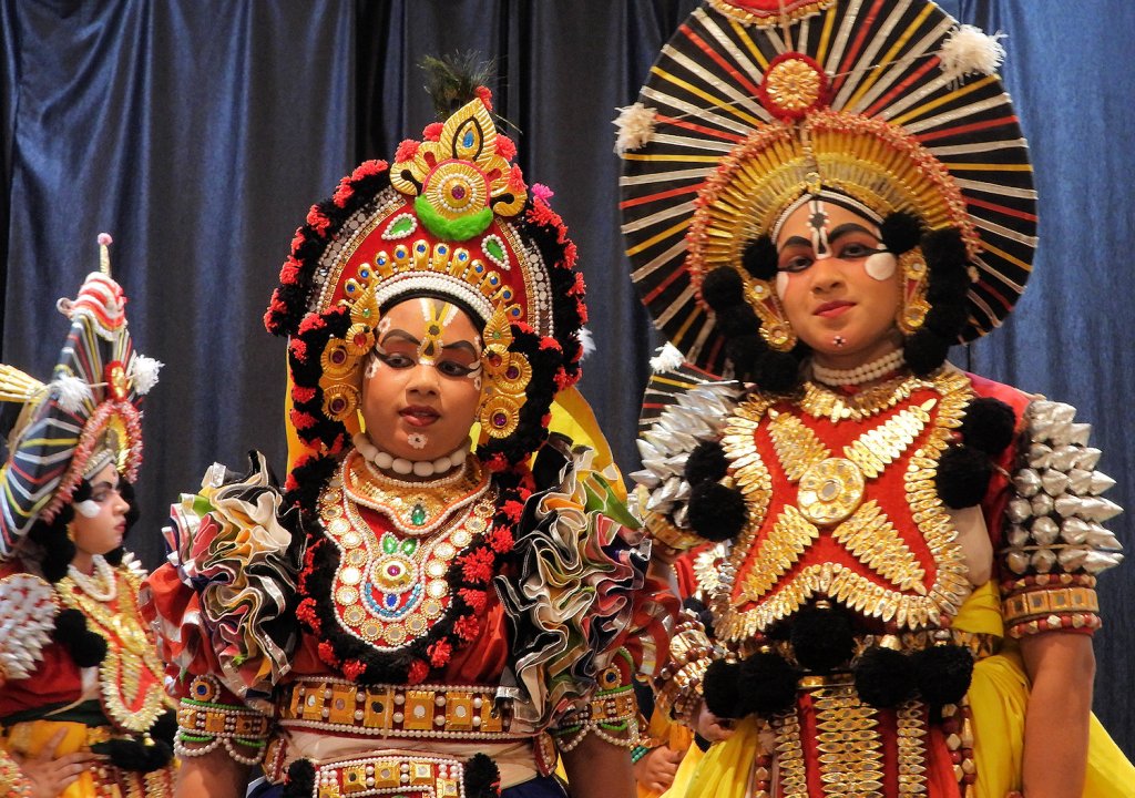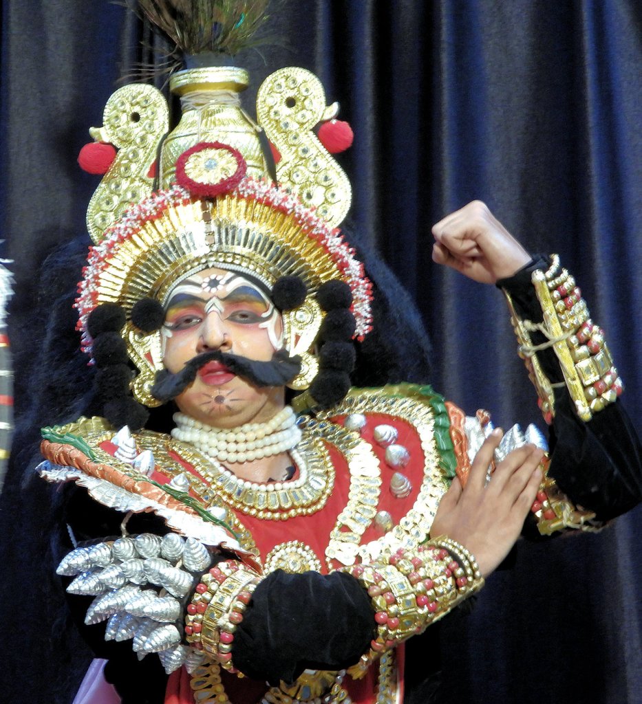 Comme l’explique Priyanka P. Mohan, « Le Yakshagana est un art du spectacle traditionnel du Karnataka, en Inde, qui mêle danse, musique, dialogues et costumes élaborés, mettant en scène des récits mythologiques et historiques. » Les spectacles de Yakshagana frappent le spectateur par leur impact visuel : costumes impressionnants, donc, mais aussi maquillages saisissants et gestuelle dynamique soulignent un message qui touche aux émotions, à la raison et à la spiritualité. Ce message est exprimé par les dialogues et les commentaires, les mimes et la chorégraphie.