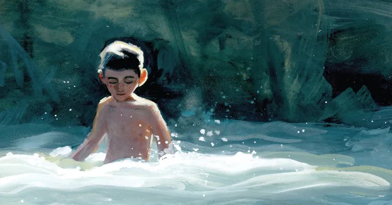 Après une journée d’école peut-être plus difficile à vivre que les autres, le père de l’enfant, constatant sa détresse, décide de l’emmener faire une balade sur les bords de la rivière. « Tu vois l’eau qui bouge ? C’est comme ça que tu parles. » L’enfant regarde l’eau. « Elle bouillonne, tournoie, gicle et se brise. Papa dit que je parle comme une rivière. »