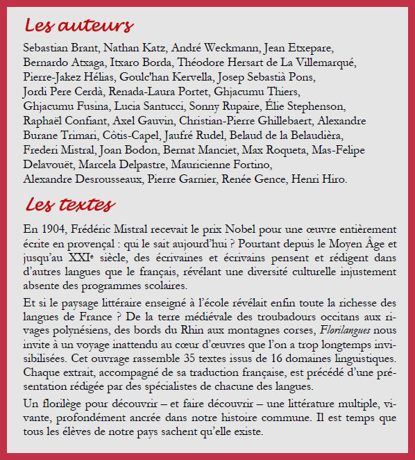 À présent, Florilangues doit vivre. « Il faut lire, faire lire, enseigner Florilangues », écrivent nos préfaciers. Parce que ce qui fait vivre un livre c’est bien sa rencontre avec un lectorat. Ce livre-ci s’adresse aussi bien au grand public qu’au monde de l’éducation : professeurs de lettres, élèves, étudiants. Les uns y trouveront les plaisirs de la lecture : la découverte, l’étonnement, l’émotion, la réflexion, la diversité… Les autres y ajouteront une dimension formatrice, pédagogique. Le but est que partout sur le territoire de la République, que l’on soit martiniquais ou occitan, alsacien, kanak ou catalan, parisien, lillois, dyonisien ou bastiais, sans enfermement régionaliste, on puisse avoir accès à des textes et des auteurs qui ont tous quelque chose de précieux à nous donner.