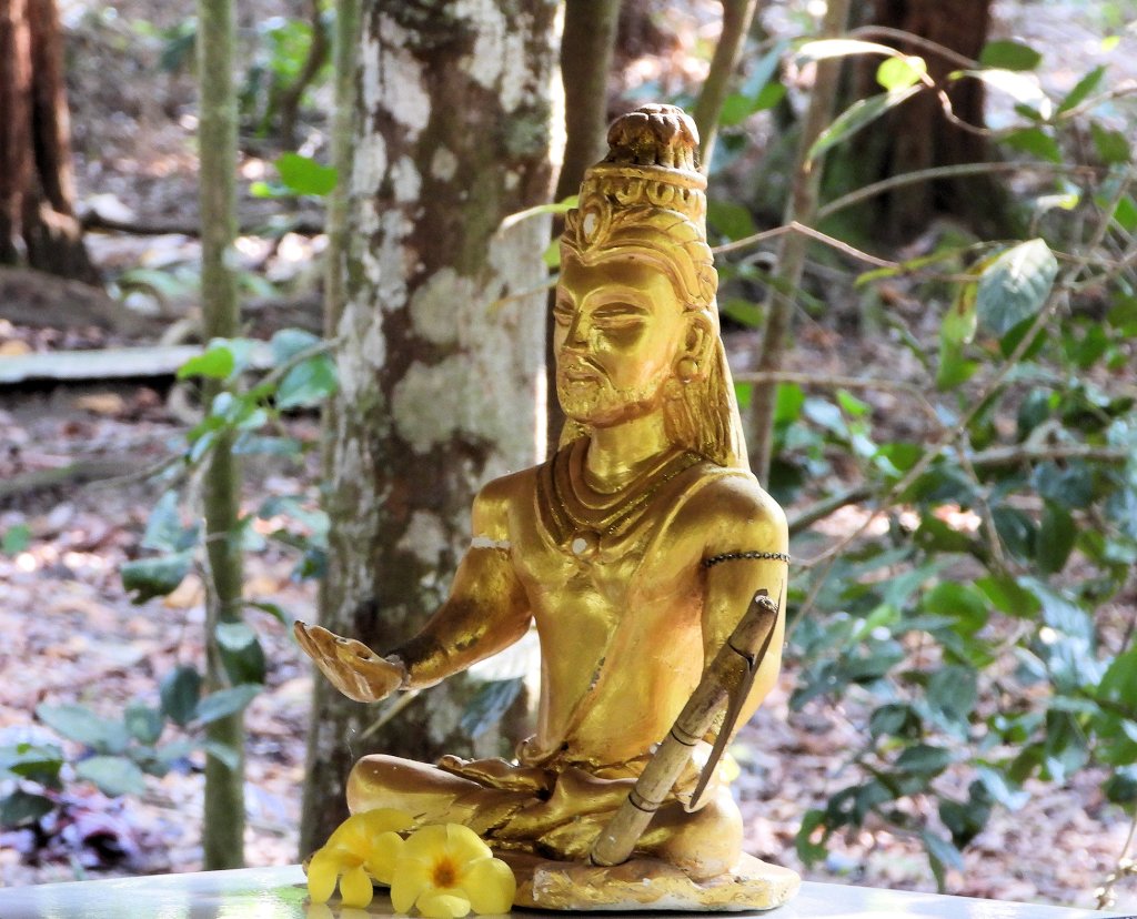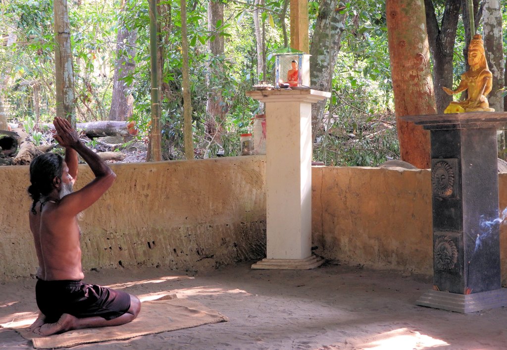 Le yoga et la méditation participent également de cet apprentissage. Trois figures emblématiques sont particulièrement vénérées dans le cadre de cet art martial . La première n’est autre que le Bouddha, puisque l’Angampora s’est développé dans le cadre de la culture cinghalaise bouddhiste… même si bien sûr il est ouvert aussi aux Tamouls hindous et, de fait, à toute personne indépendamment de sa nationalité, sa religion, son sexe. La deuxième figure est Ravana, que nous avons déjà évoqué. Un Occidental peut bien sûr être choqué que soit ainsi choisie comme personnage tutélaire ce que l’on appelle un “démon”. Mais pour qui connaît la culture et le mode de pensée sud-asiatique, on ne sera pas surpris : Ravana a été d’abord un extraordianire yogi, fidèle du dieu Shiva, et il acquit des pouvoirs spirituels hors du commun, indépendamment de son “côté obscur”. La troisième figure est le dieu hindou Kataragama, particulièrement populaire et important au Sri Lanka.